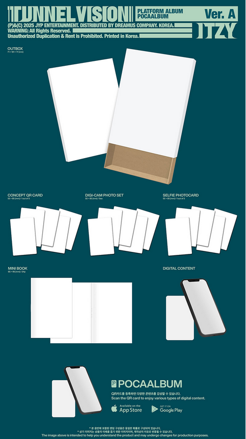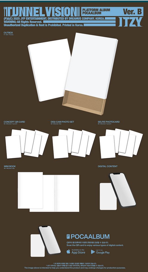 ITZY – TUNNEL VISION (POCAALBUM) (2types Random Ver.) — официално и оригинално издание на JYP Entertainment, създадено за всички MIDZY, които обичат компактните, модерни и колекционерски албуми! POCAALBUM версията е дигитален формат, който включва QR карта за достъп до ексклузивно съдържание, фотокарти и визуално оформен мини сет — съвременен начин да се наслаждаваш на ITZY, без да губиш автентичността на физическия албум.