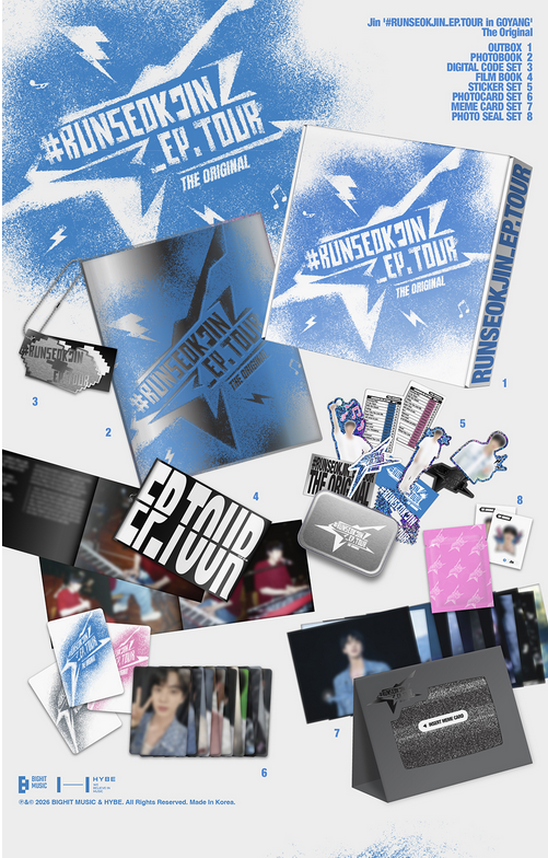 Jin – ‘#RUNSEOKJIN_EP.TOUR in GOYANG’ The Original е официален колекционерски продукт, свързан с концертното събитие RUN SEOKJIN EP. TOUR in GOYANG. Изданието улавя специалната атмосфера на турнето и сценичното присъствие на Jin чрез висококачествени визуални материали и ексклузивно съдържание.